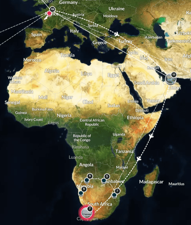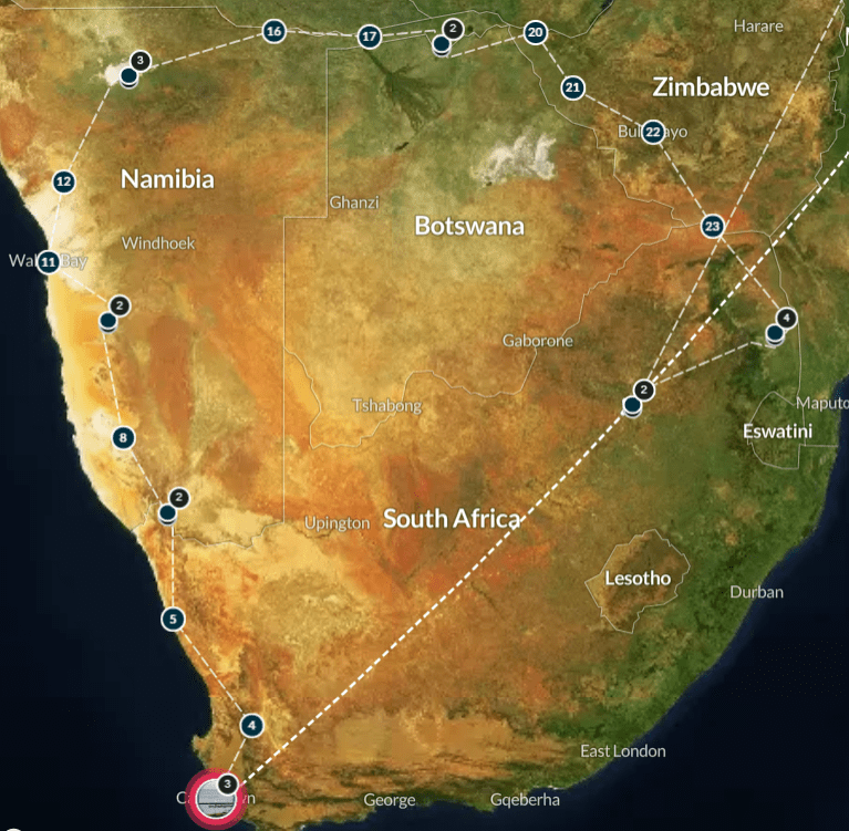 Puis, après une semaine au Cap du 7 au 12 juillet, nous prévoyons une boucle de 6.500km en 4×4 équipé de tentes sur le toit. Nous partirons du Cap pour arriver à Johannesburg, nous traverserons une grande partie de la Namibie, avec un passage au Botswana et au Zimbabwe.