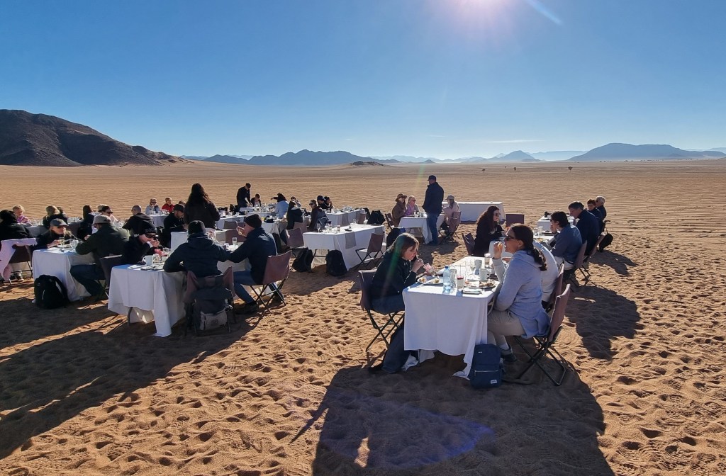 A l’atterrissage, un petit déjeuner nous attendait en plein désert.