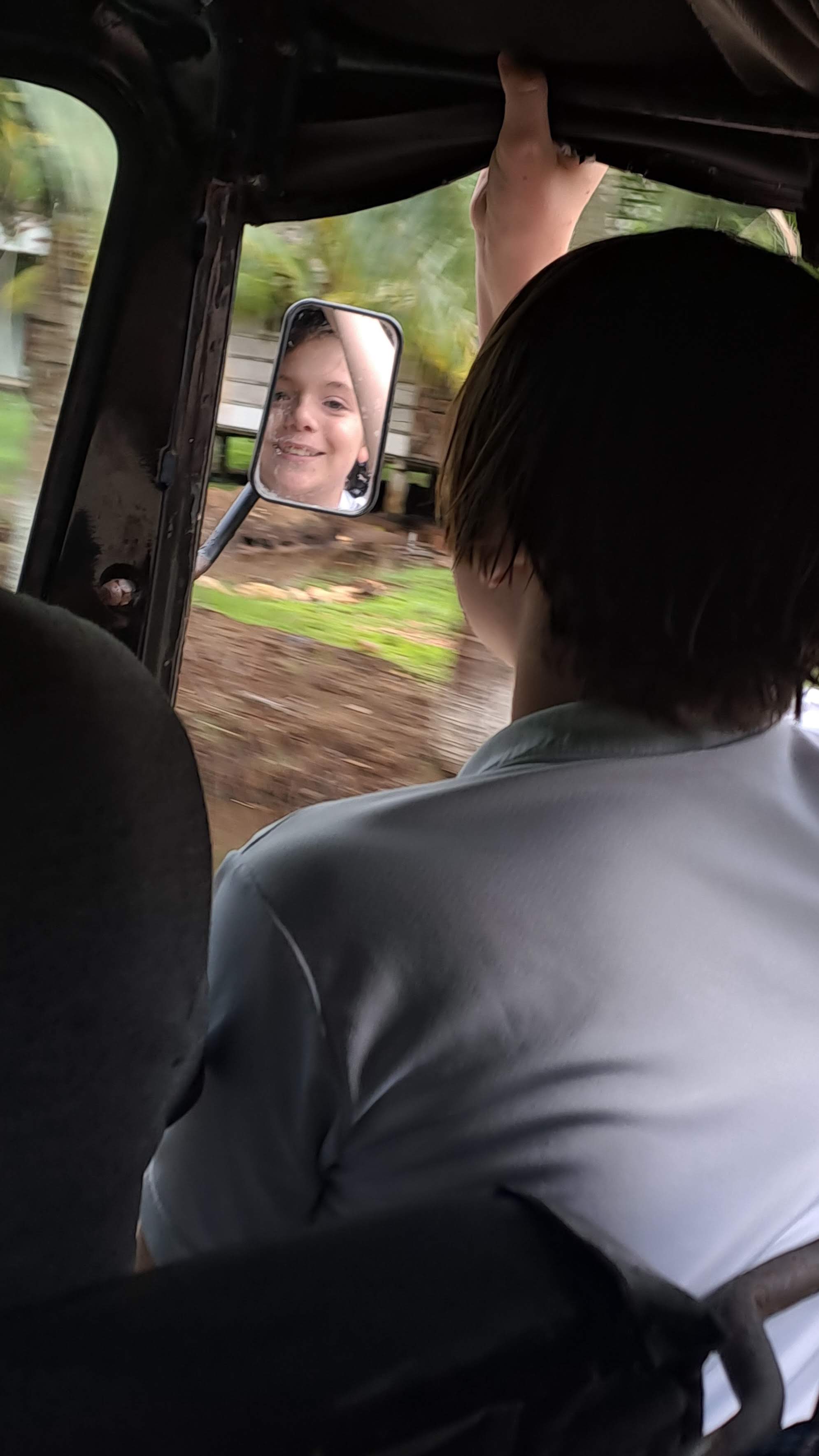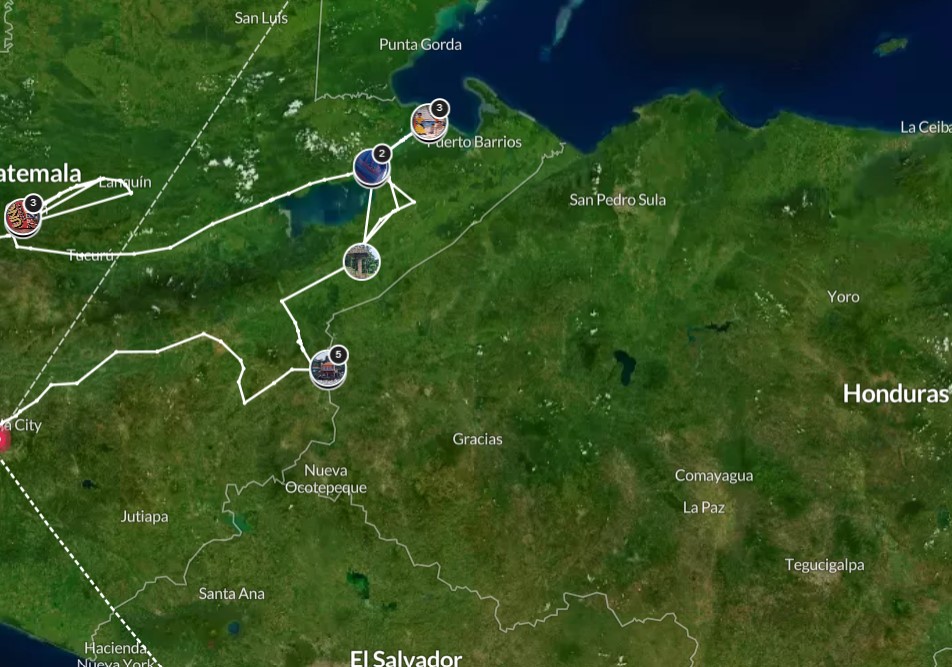 Le trajet pour Copán commence par la remontée du Rio Dulce en lancha. Après avoir récupéré la voiture et nos 10 kgs de linge tout propres à l’hôtel Banana (coup de génie ! on a laissé 2 énormes sacs de linge sale à l’hôtel avant de partir poir Livingston), on prend la route. Google maps nous donne le choix entre 3 trajets. On élimine le plus court, car on n’y trouve aucune trace de poste frontière pour le Honduras. Ça doit être un chemin de contrebandiers ! On élimine le plus long, et donc on s’embarque pour 4h20 de route. Google Maps s’entête à nous faire prendre le chemin le plus long, mais on est encore plus têtu. Et nous voici sur un chemin de terre et de cailloux, avec un brouillard à couper au couteau. Ambiance Blair Witch … Heureusement qu’on a troqué la Suzuki Swift contre un 4×4.